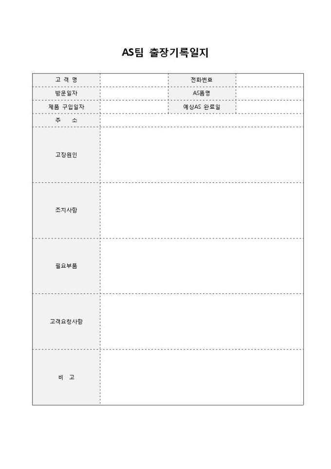 9,000원/월AS팀 출장기록일지입니다. AS출장 방문시 작성하는 문서로 고객명, 방문일자, 고장원인, 조치사항 등으로 구성되어 있습니다.