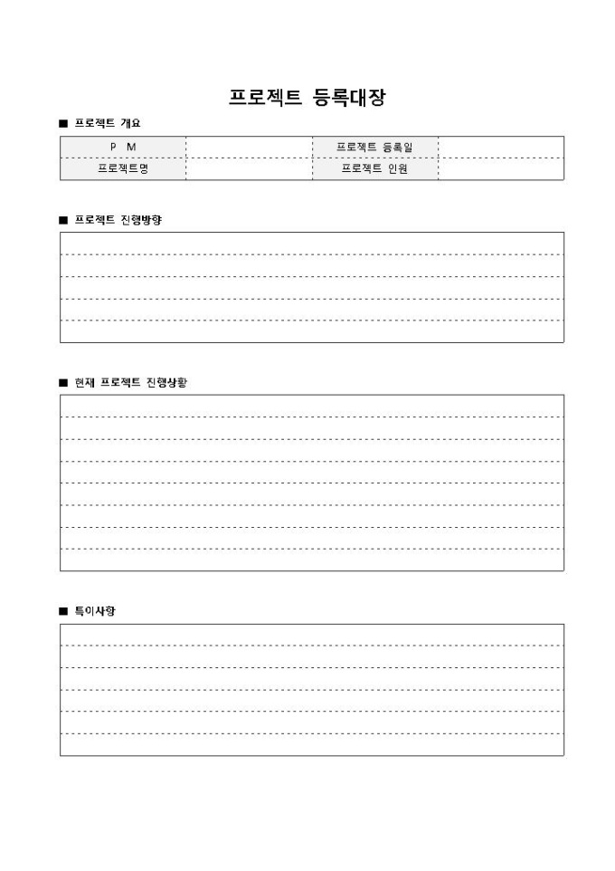 9,000원/월프로젝트 등록대장입니다. 프로젝트를 등록하고자 할 때 작성하는 문서로 프로젝트명, PM, 프로젝트 등록일, 진행방향 등으로 구성되어 있습니다.
