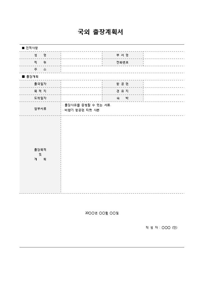 9,000원/월국외 출장계획서입니다. 국외 출장계획에 대한 내용을 작성하는 문서로 인적사항 및 출국일자, 항공편, 목적지 등으로 구성되어 있습니다.