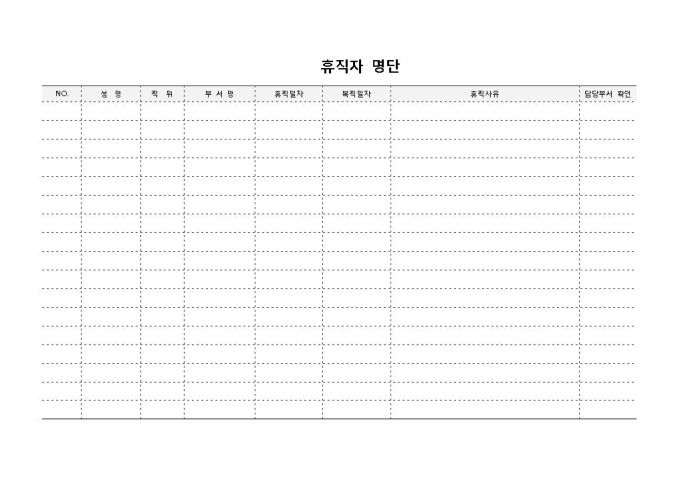 9,000원/월휴직자 명단입니다. 휴직자 명단을 작성하여 관리하는 문서로 성명, 직위, 부서명, 휴직일자, 복직일자, 휴직사유 등으로 구성되어 있습니다.