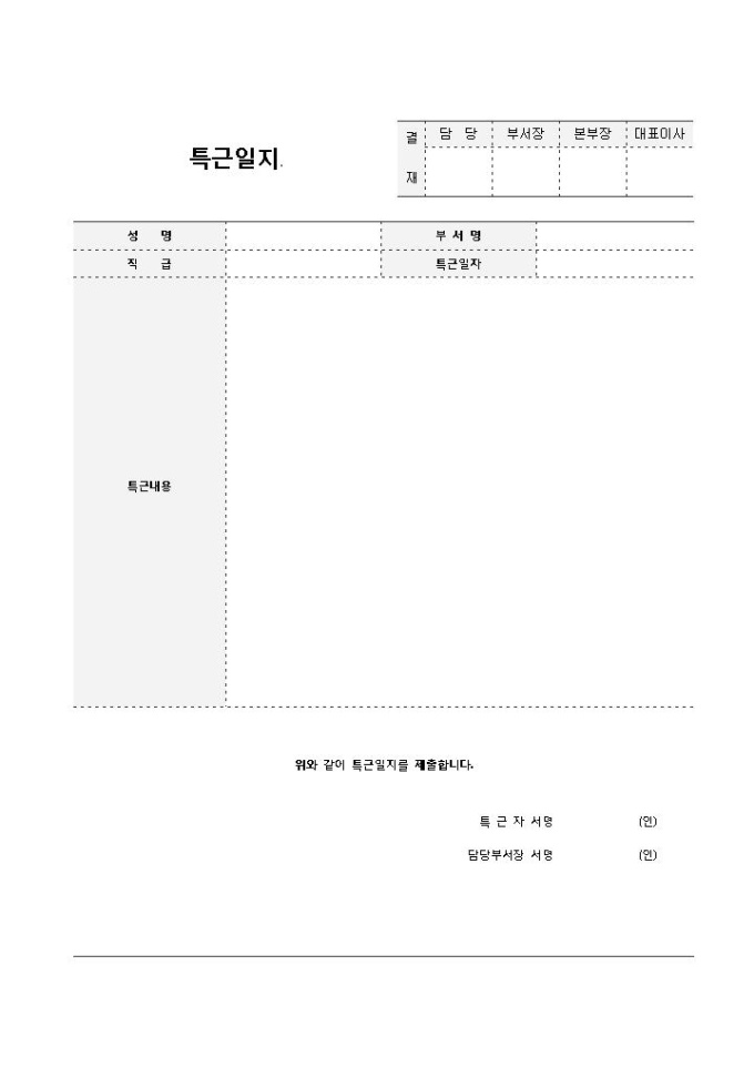 9,000원/월특근일지(간단양식)입니다. 특근한 후 작성하는 일지로 성명, 부서명, 직급, 특근일자, 특근내용 등으로 구성되어 있습니다.