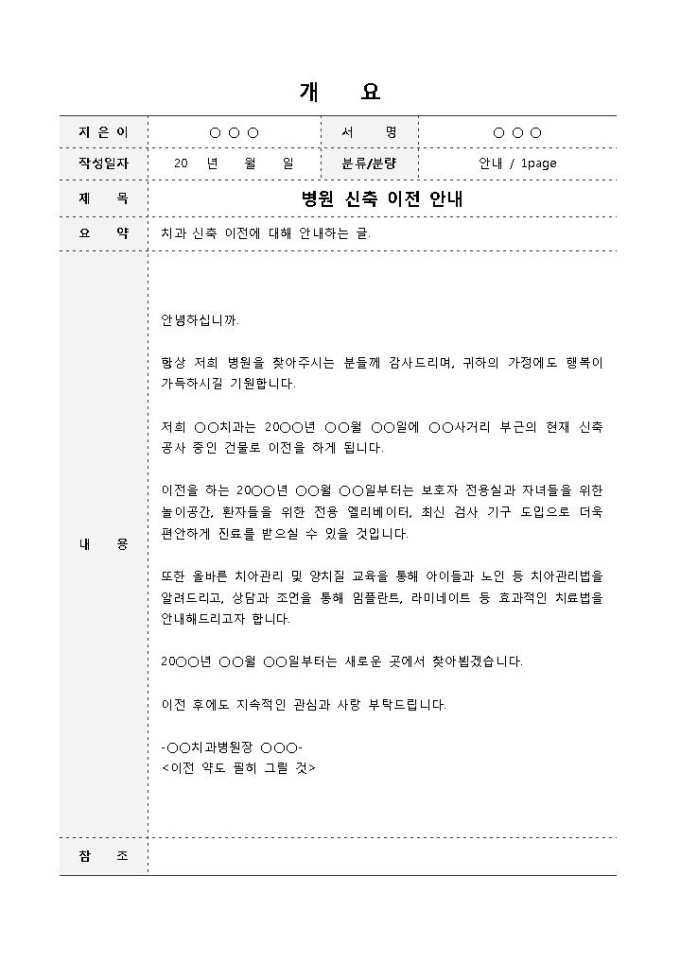 9,000원/월병원 신축이전 안내(치과)입니다. 병원 이전 시 이전에 대한 안내 내용을 작성하고자 할 때 사용하는 서식입니다.