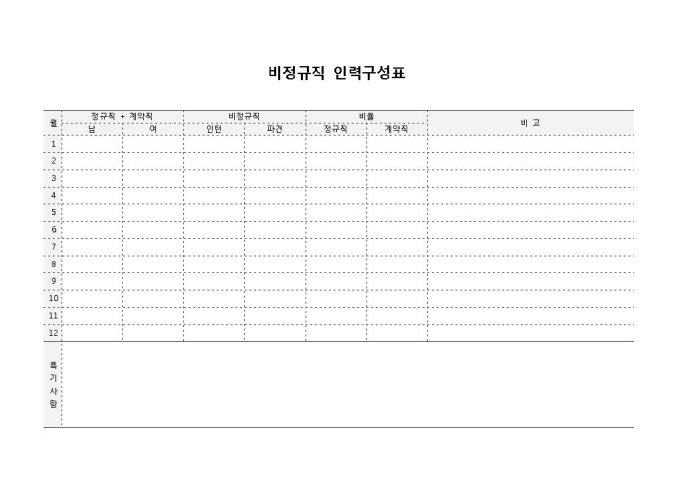 9,000원/월비정규직 인력구성표입니다. 정규직과 계약직, 비정규직으로 구분하여 구성 수를 파악할 수 있는 표형태의 서식입니다.