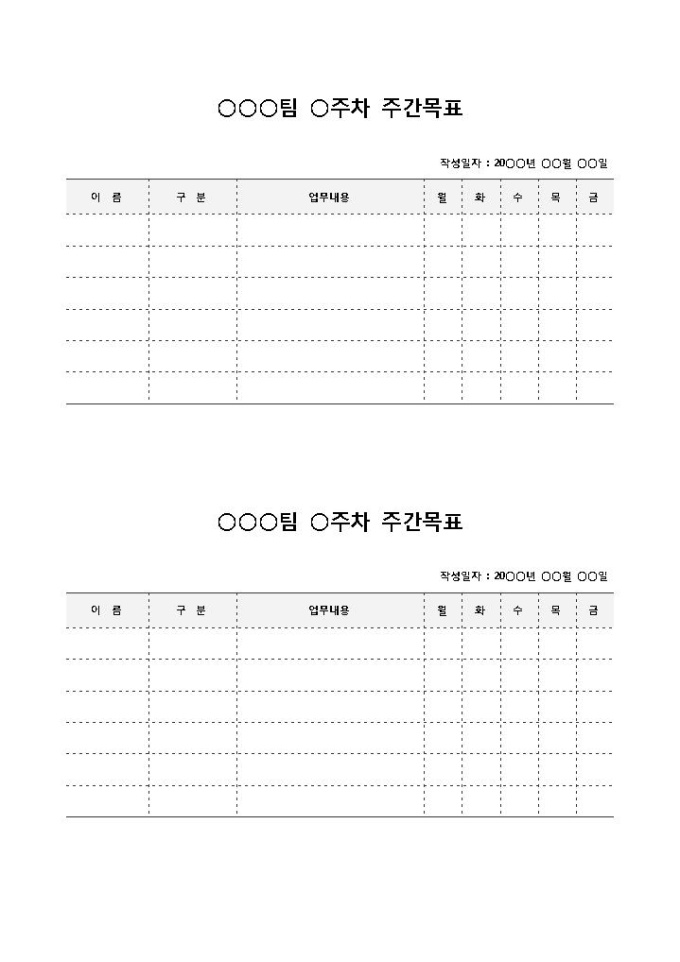 9,000원/월팀 주간목표입니다. 팀별 주간목표 및 업무내용을 작성하는 표 형태의 서식으로 이름, 구분, 업무내용, 요일별로 구분되어 있습니다.