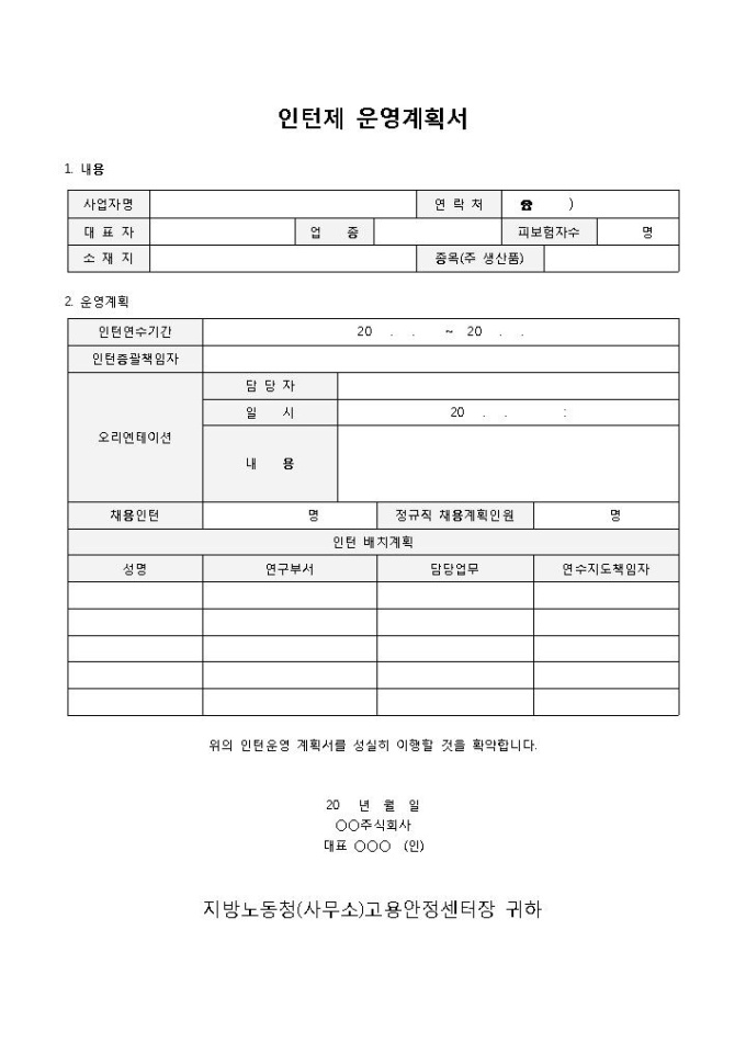 9,000원/월인턴제운영계획서(일반양식)입니다. 인턴제 운영 계획에 대하여 작성하는 문서로 사업자명, 대표자, 인턴연수기간, 인턴총괄책임자, 오리엔테이션 등으로 구성되어 있습니다.
