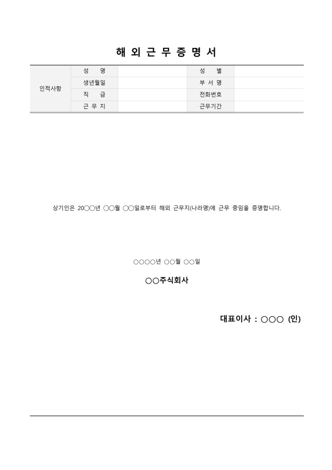 9,000원/월해외근무증명서입니다. 해외 근무 중인 내용을 증명하기 위한 증명서입니다.