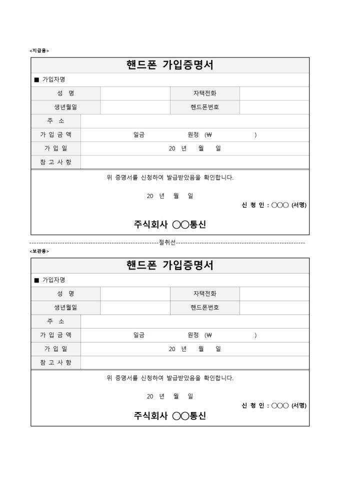 9,000원/월핸드폰 가입증명서입니다. 가입자 정보, 주소, 가입금액, 가입일 등으로 구성되어 있습니다.