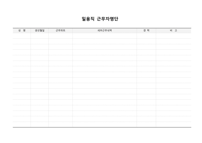 9,000원/월일용직 근무자명단입니다. 성명, 생년월일, 근무파트, 세부근무내역, 경력 비고 등으로 구성되어 있습니다.