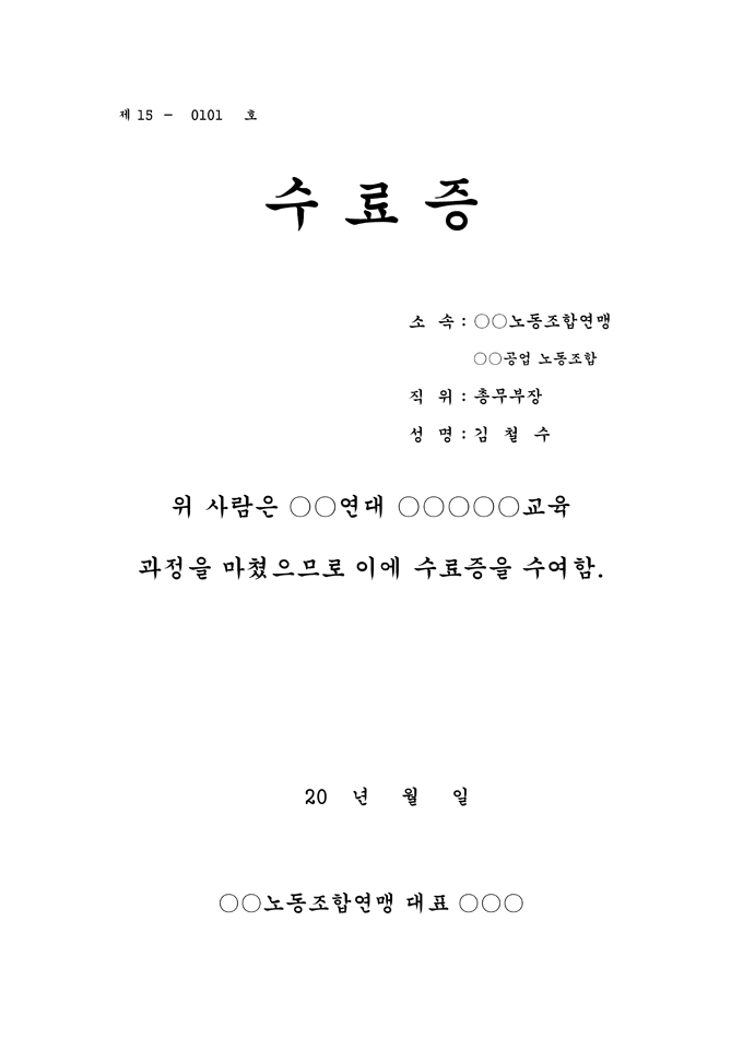수료증(노동조합 교육확인)입니다. 소속, 직위, 성명, 교육 수료 내용, 날짜, 대표자명 등의 항목으로 구성되어 있습니다. 노동조합 교육 시 활용할 수 있습니다.