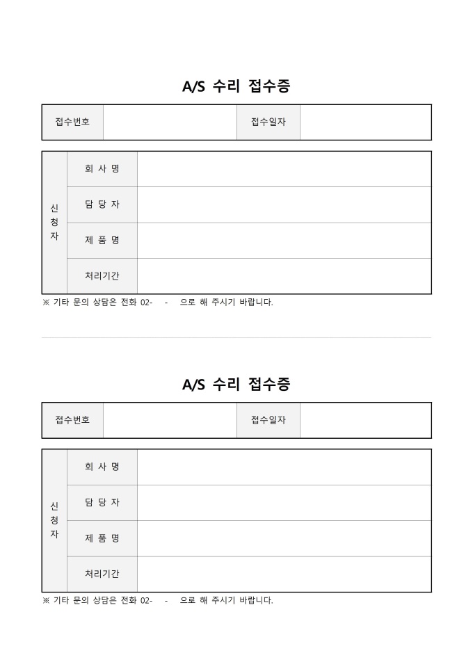 9,000원/월AS수리접수증입니다. 접수번호, 접수일자, 신청자, 회사명, 담당자, 제품명, 처리기간 등의 항목으로 구성되어 있습니다.