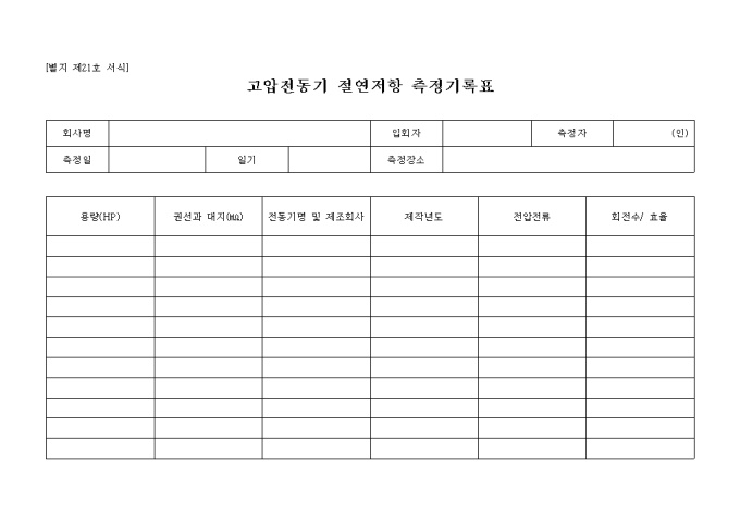 9,000원/월[별지 제21호 서식] 전력기술관리법시행규칙21서식(95.--.--)-고압전동기절연저항측정기록표 입니다. 용량(HP), 권선과 대지(㏁), 전동기명 및 제조회사, 제작년도, 전압전류, 회전수/ 효율의 항목으로 구성된 양식입니다.