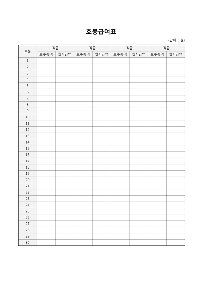 9,000원/월호봉급여표입니다. 호봉, 직급, 보수총액, 월지급액 등의 항목으로 구성되어 있습니다.