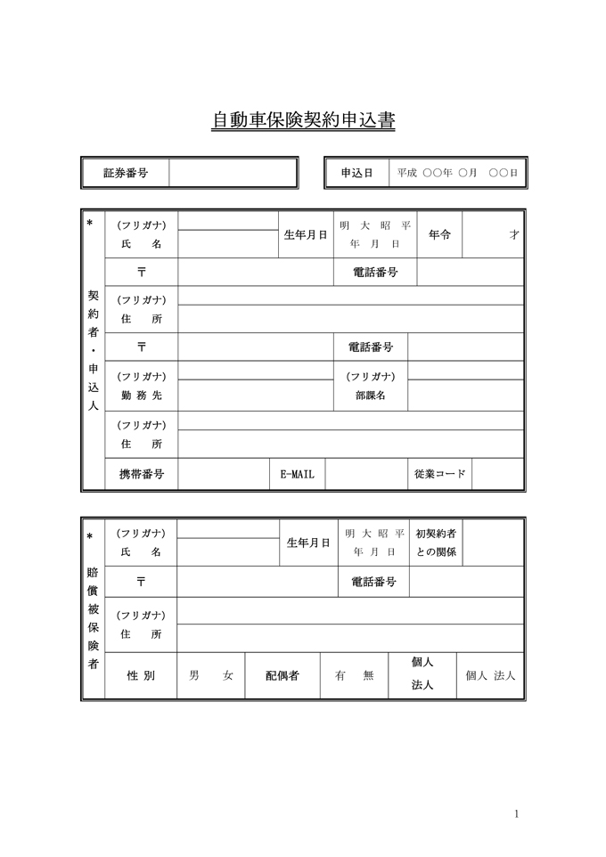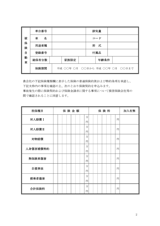 9,000원/월자동차 보험계약신청서(일본어)입니다. 자동차 보험계약신청서(일본어) 양식이 일본어로 작성된 문서양식입니다. 거래, 보험거래 분야에 활용할 수 있습니다. 자동차 보험계약신청서(일본어) 양식