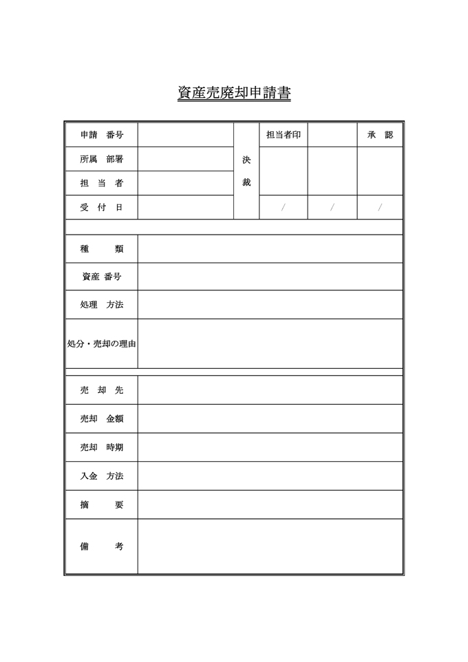 9,000원/월자산매각 폐각 신청서(일본어)입니다. 자산매각 폐각 신청서(일본어) 양식이 일본어로 작성된 문서양식입니다. 경리업무, 경리서식 분야에 활용할 수 있습니다. 자산매각 폐각 신청서(일본어) 양식