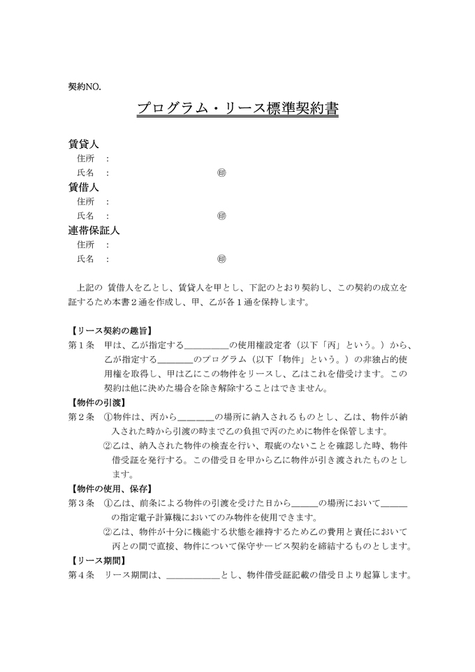 9,000원/월프로그램 리스표준계약서1 (일본어)입니다. 프로그램 리스표준계약서1 (일본어) 양식이 일본어로 작성된 문서양식입니다. 계약서, 계약서 분야에 활용할 수 있습니다. 프로그램 리스표준계약서1 (일본어) 양식
