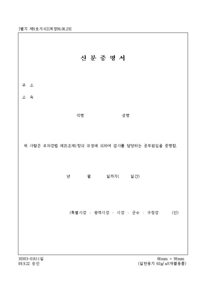 9,000원/월[별지 제9호서식] 주차장법 제25조제1항의 규정에 의하여 검사를 담당하는 공무원임을 증명하는 양식입니다.