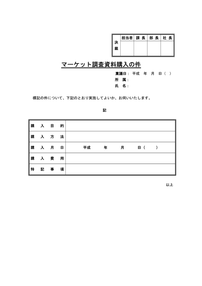 9,000원/월시장조사 자료구입 결의서(일본어)입니다. 시장조사 자료구입 결의서(일본어) 양식이 일본어로 작성된 문서양식입니다. 회사서식, 업무운용 분야에 활용할 수 있습니다. 시장조사 자료구입 결의서(일본어) 양식
