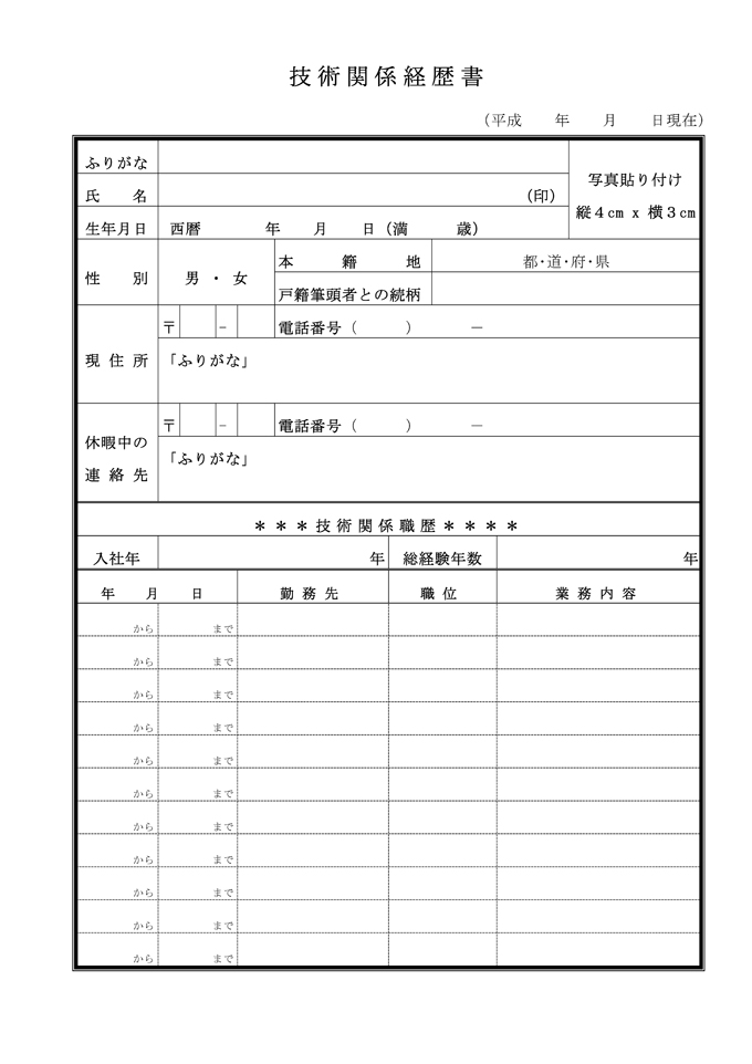 9,000원/월기술관계경력서(일본어)입니다. 기술관계경력서(일본어) 양식이 일본어로 작성된 문서양식입니다. 회사서식, 인사노무 분야에 활용할 수 있습니다. 기술관계경력서(일본어) 양식