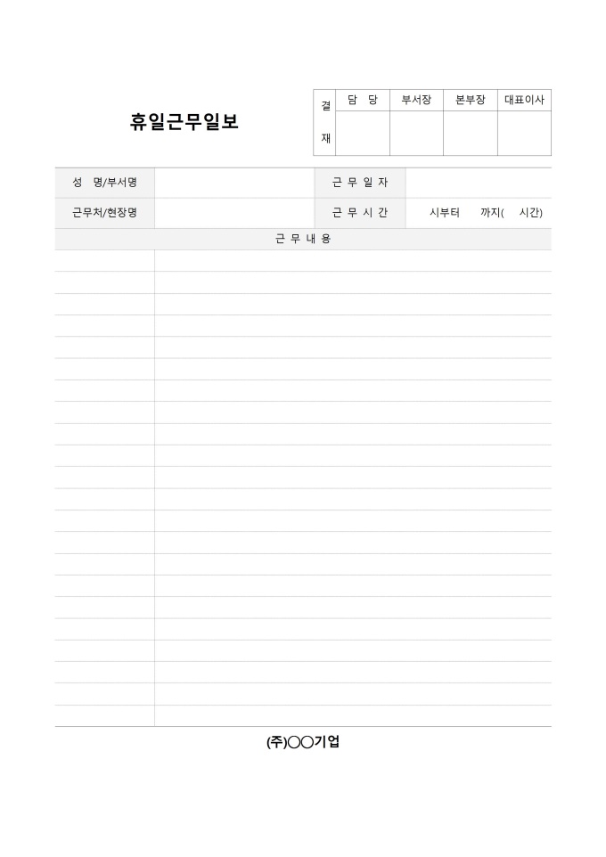 9,000원/월휴일근무일보입니다. 성명, 부서명, 근무일자, 근무처, 현장명, 근무시간, 근무내용 등의 항목으로 구성되어 있습니다.