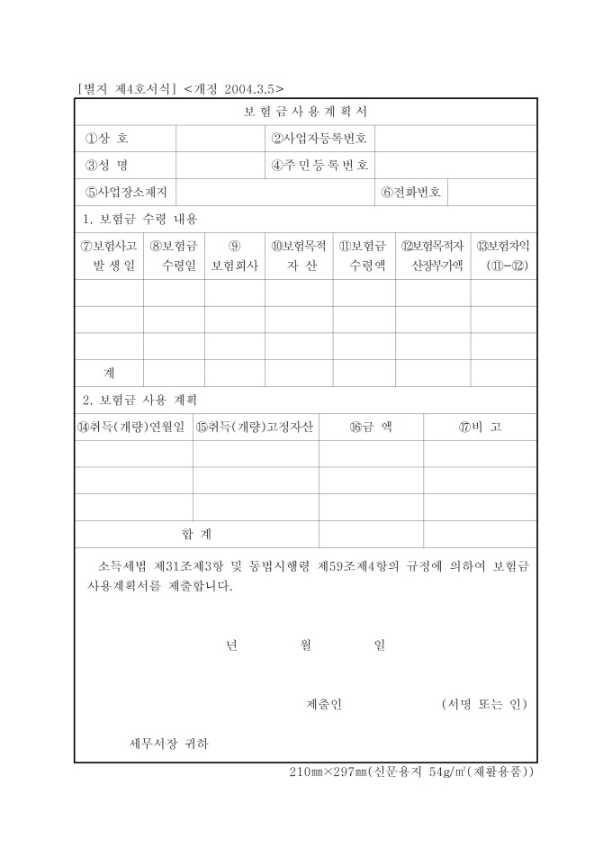 9,000원/월보험금사용계획서입니다. 소득세법 시행규칙 별지서식
