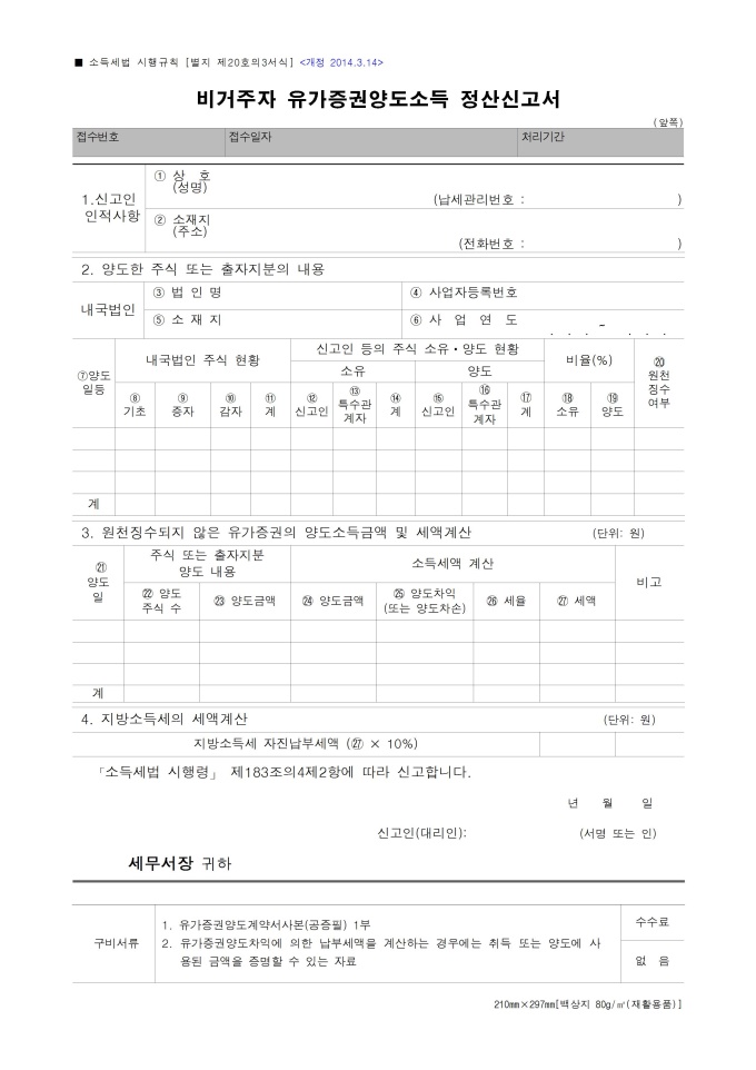 9,000원/월비거주자 유가증권양도소득 정산신고서입니다. 소득세법 시행규칙 별지서식