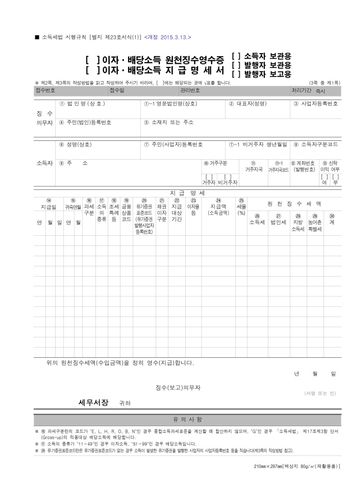 9,000원/월[이자ㆍ배당소득 원천징수영수증¸ 이자ㆍ배당소득 지급명세서(소득자 보관용¸ 발행자 보관용¸ 발행자 보고용)입니다. 소득세법 시행규칙 별지서식