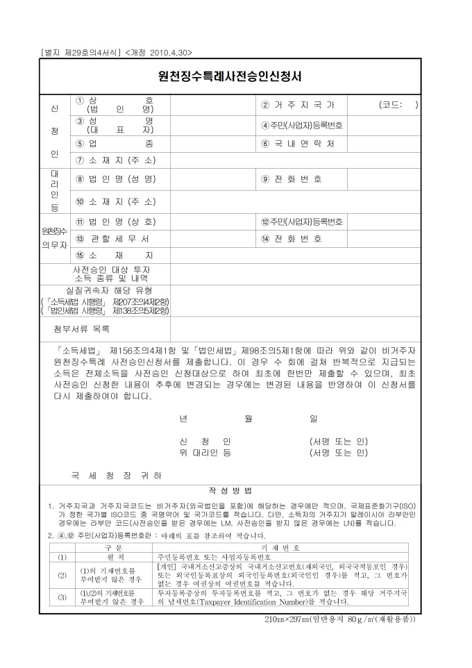 9,000원/월원천징수특례사전승인신청서입니다. 소득세법 시행규칙 별지서식
