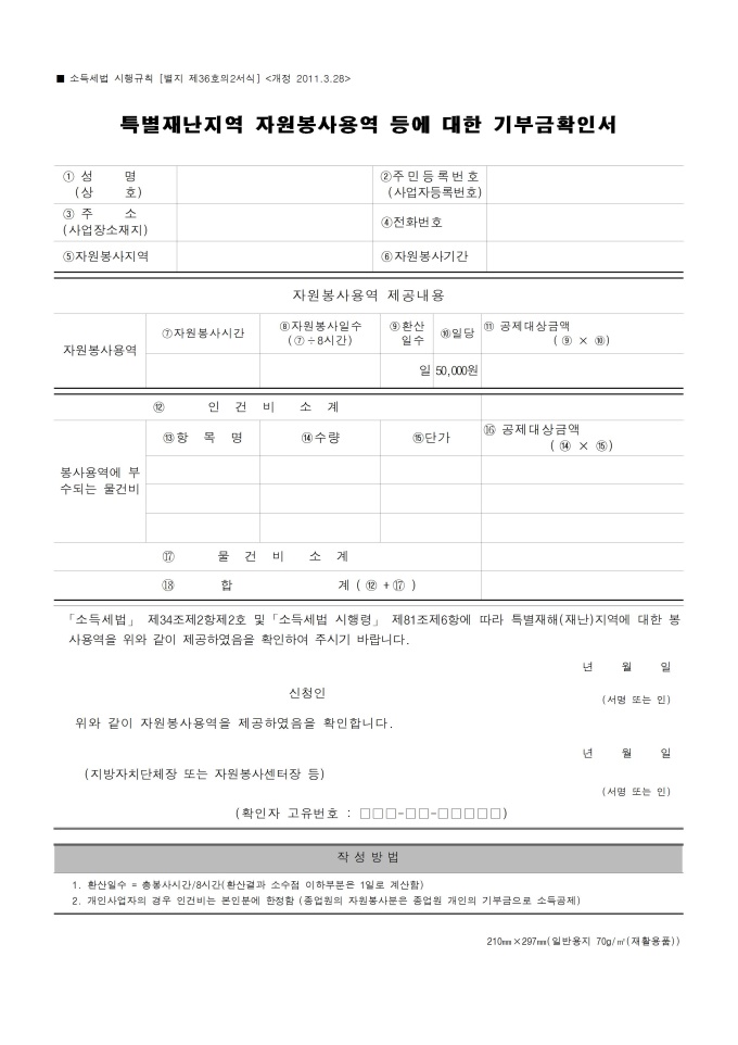 9,000원/월특별재난지역 자원봉사용역 등에 대한 기부금확인서입니다. 소득세법 시행규칙 별지서식