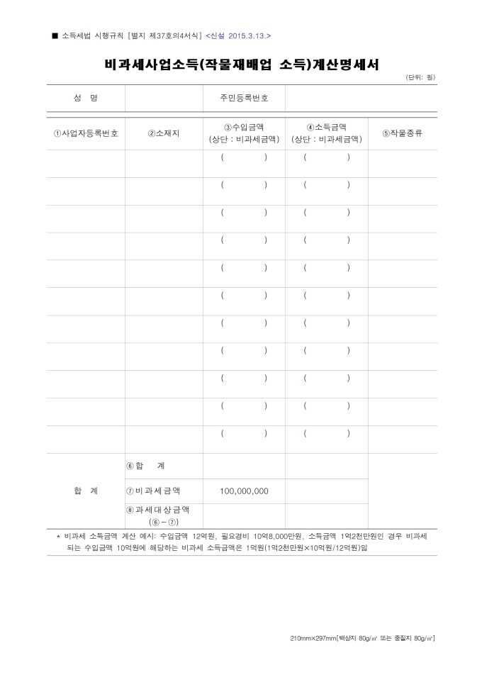 9,000원/월비과세사업소득(작물재배업 소득)계산명세서입니다. 소득세법 시행규칙 별지서식