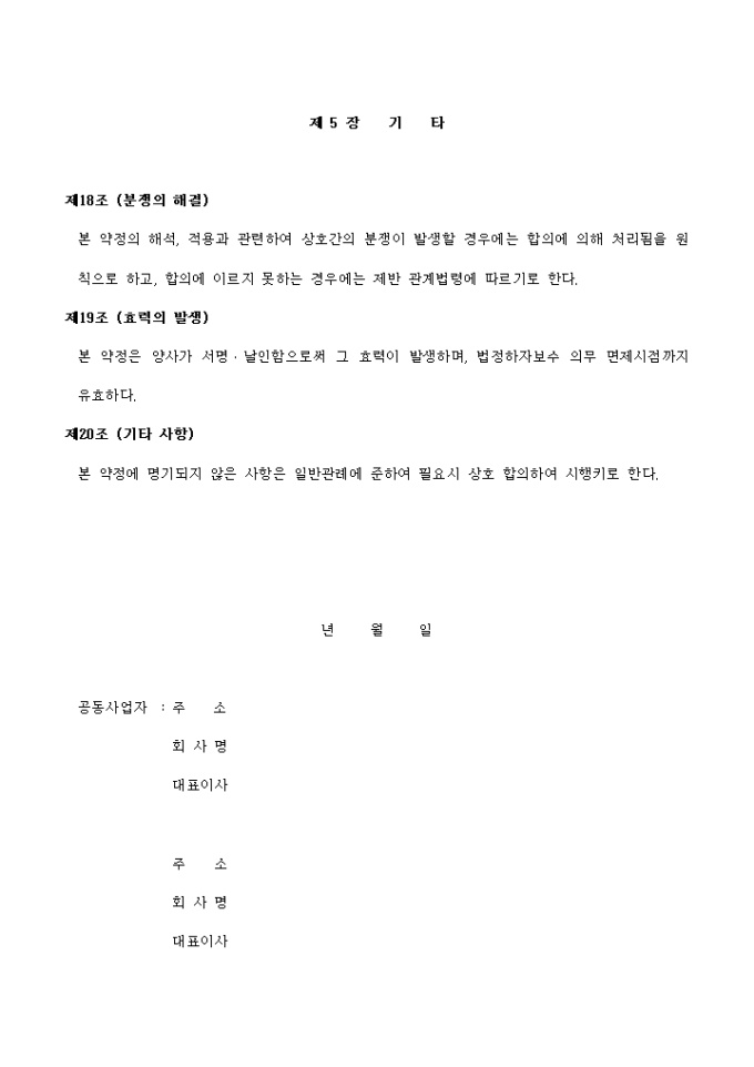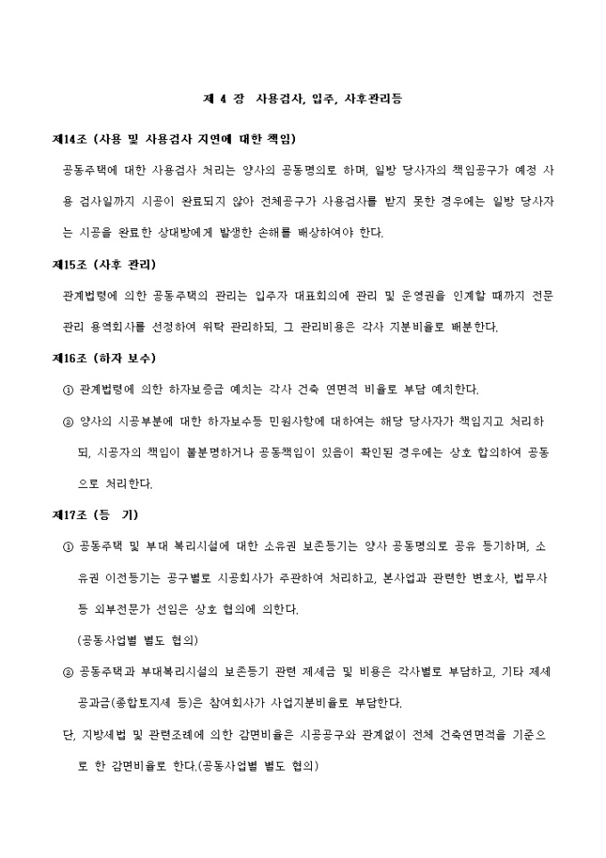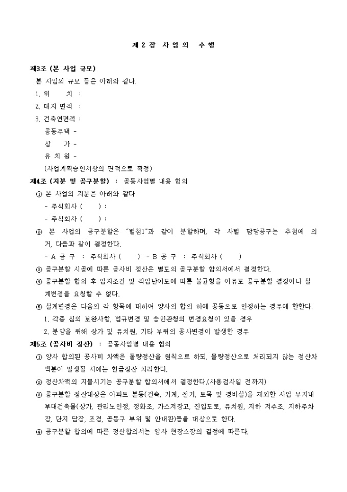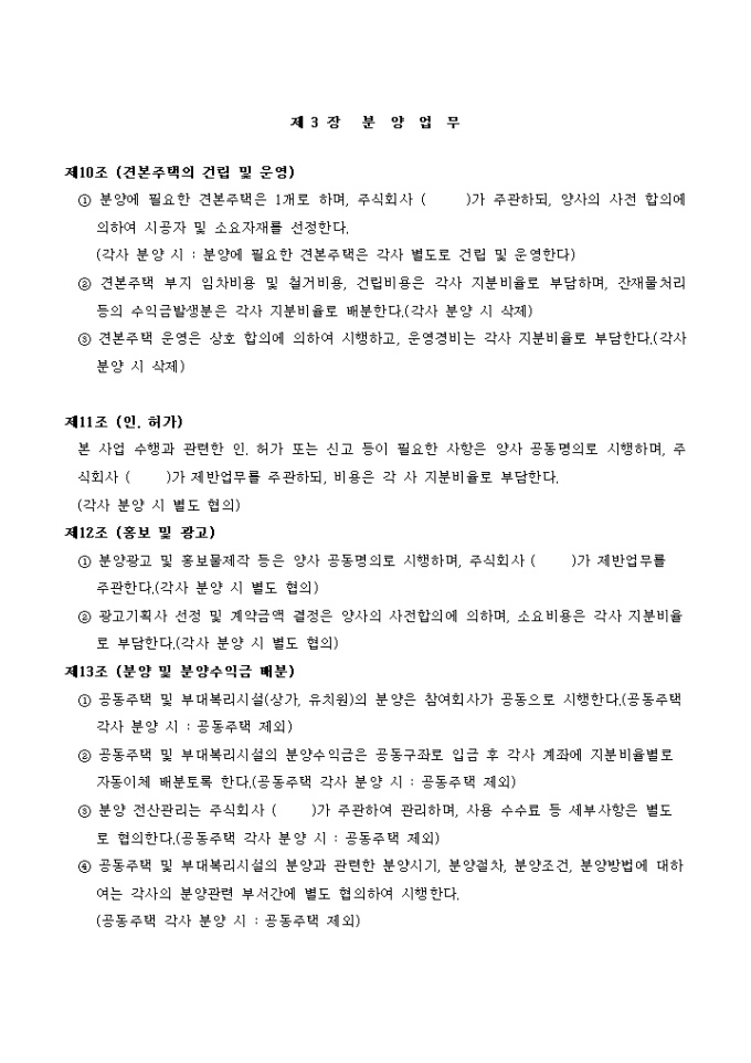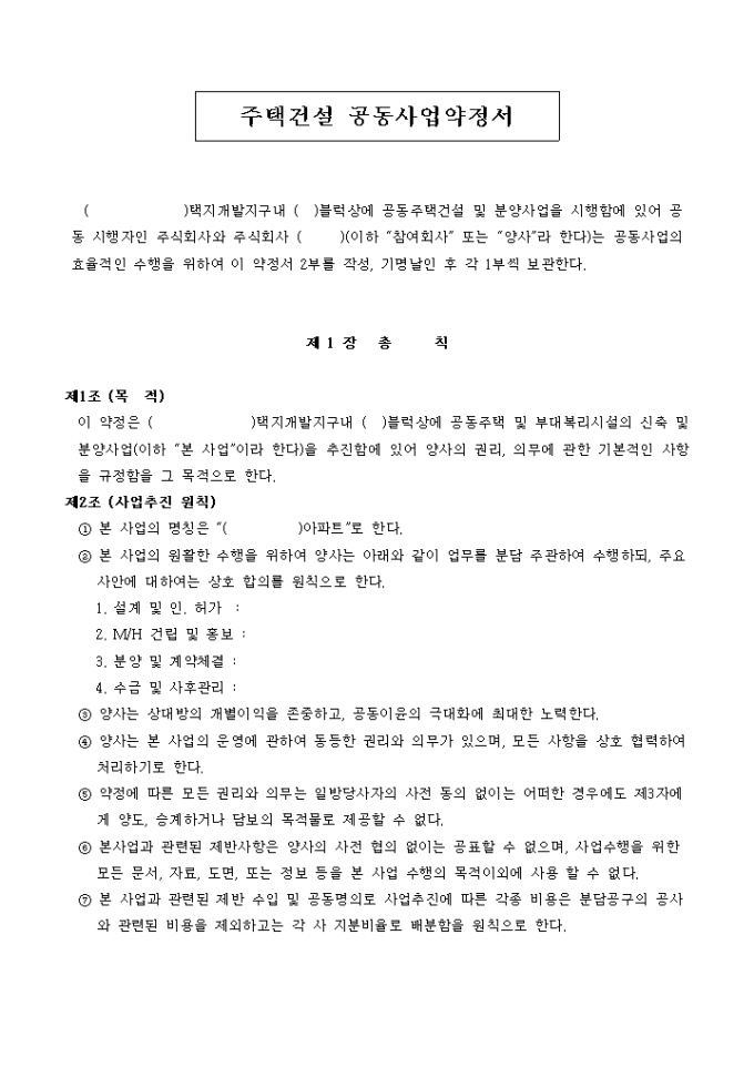 9,000원/월주택관련 주택건설공동사업약정서입니다. 다음을 참고하세요. 제 1 장 총 칙 제 2 장 사업의 수행 제 3 장 분양업무 제 4 장 사용검사, 입주, 사후관리등 제 5 장 기 타