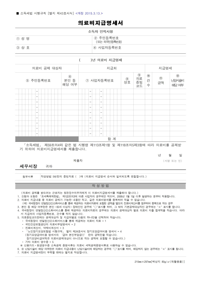 9,000원/월의료비지급명세서입니다. 소득세법 시행규칙 별지서식