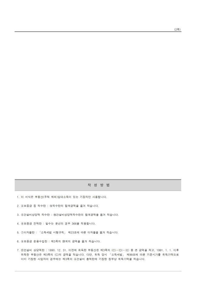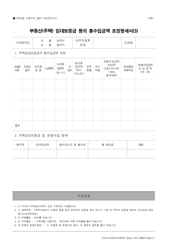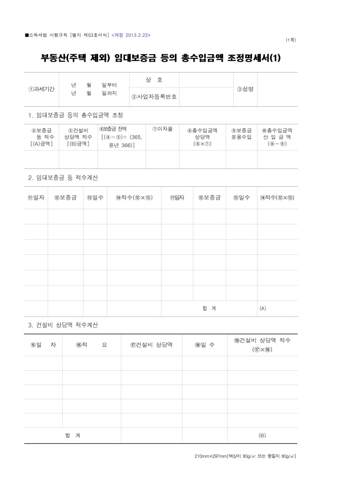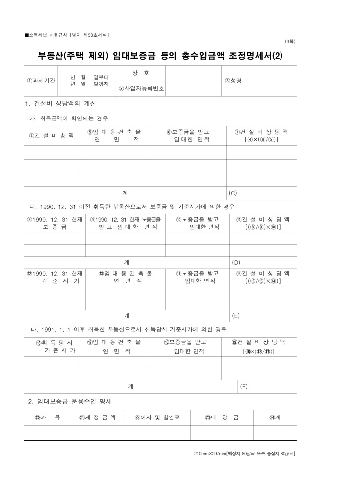 9,000원/월부동산(주택 제외) 임대보증금 등의 총수입금액 조정명세서입니다. 소득세법 시행규칙 별지서식