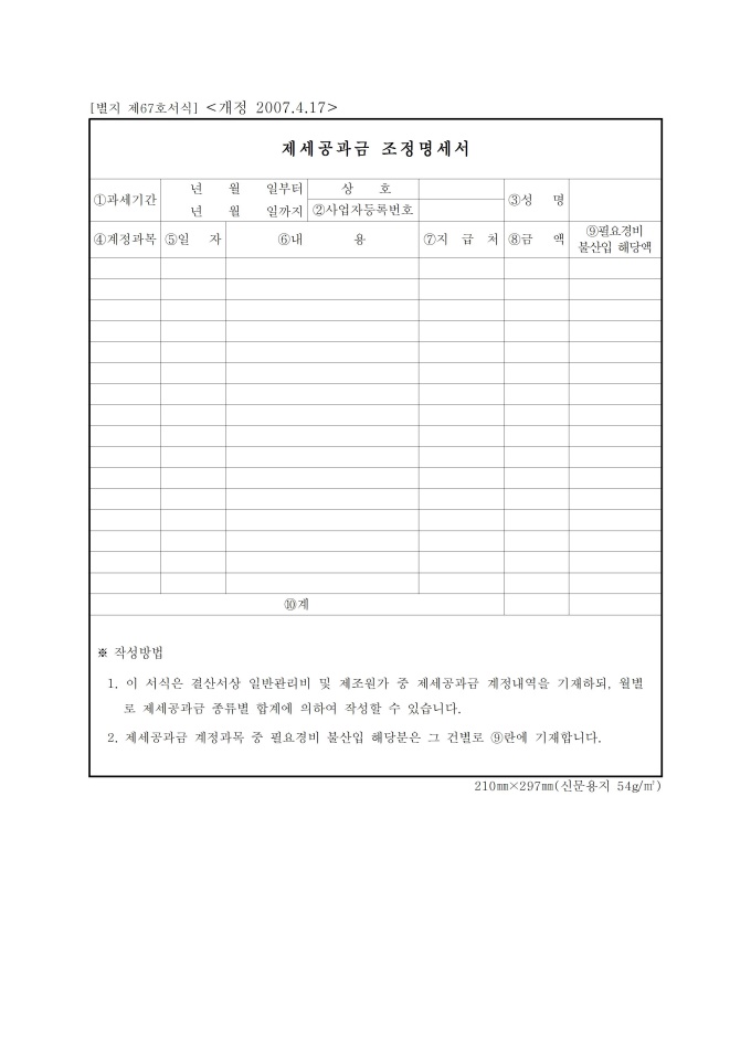 9,000원/월제세공과금조정명세서입니다. 소득세법 시행규칙 별지서식
