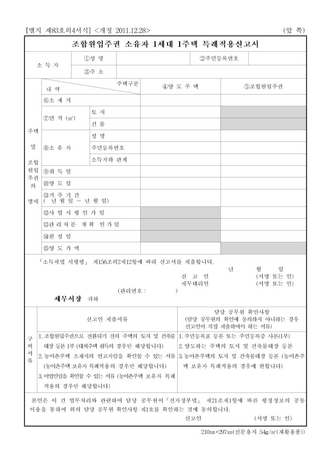 9,000원/월조합원입주권 소유자 1세대 1주택 특례적용신고서입니다. 소득세법 시행규칙 별지서식