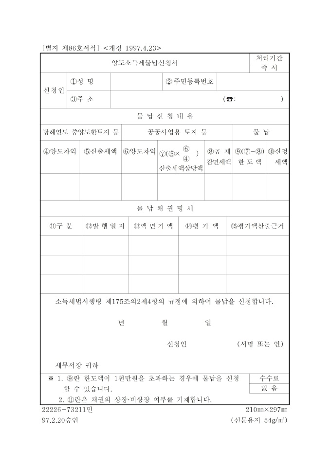 9,000원/월양도소득세물납신청서입니다. 소득세법 시행규칙 별지서식