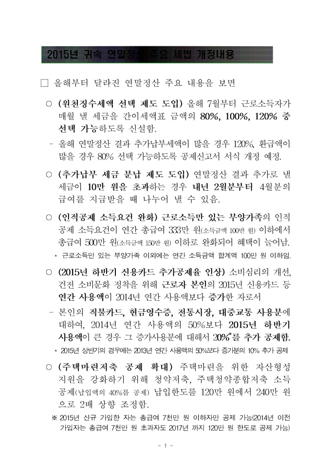9,000원/월[2015년 연말정산] 2015년 귀속 연말정산 주요 세법 개정내용입니다. 원천징수(연말정산)안내