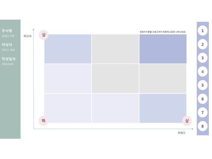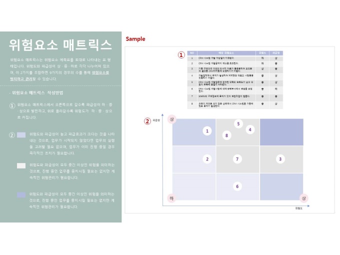 위험요소 매트릭스입니다. 업무 실행 중 실행관리 시 위험요소를 방지하고 관리할 수 있는 문서로 위험요소 매트릭스 작성방법과 표로 구성되어 있습니다.