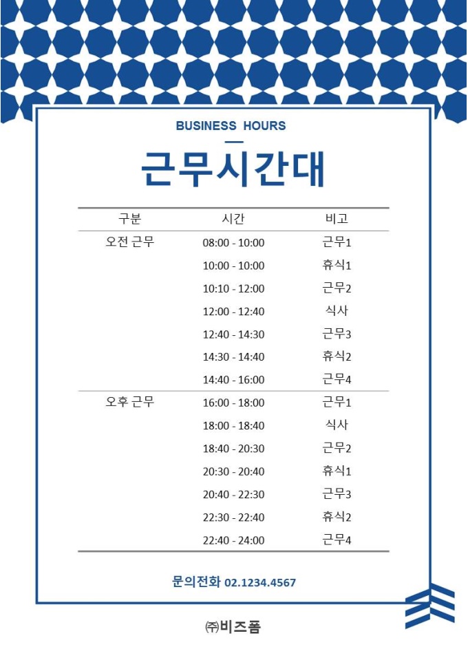 근무시간대(파란색 별무늬, 인테리어 디자인)입니다. A4규격에 맞춰 출력한 후 상황에 맞게 제작 혹은 기세합니다.