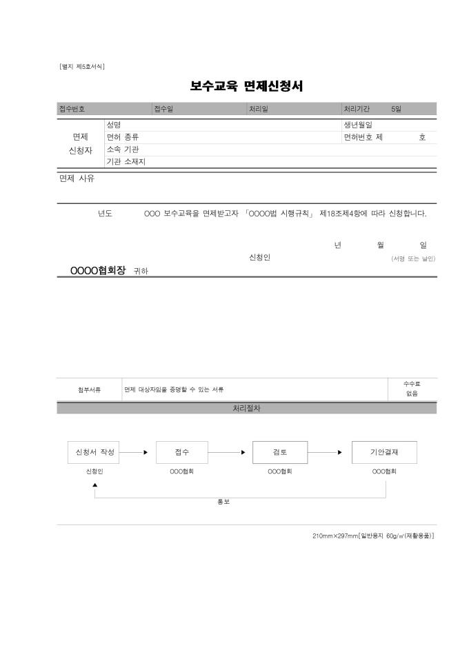 9,000원/월보수교육면제신청서입니다. 정부서식으로 보수교육면제를 희망할때 사용되고 있습니다. ※ 출 처 : 보건복지부