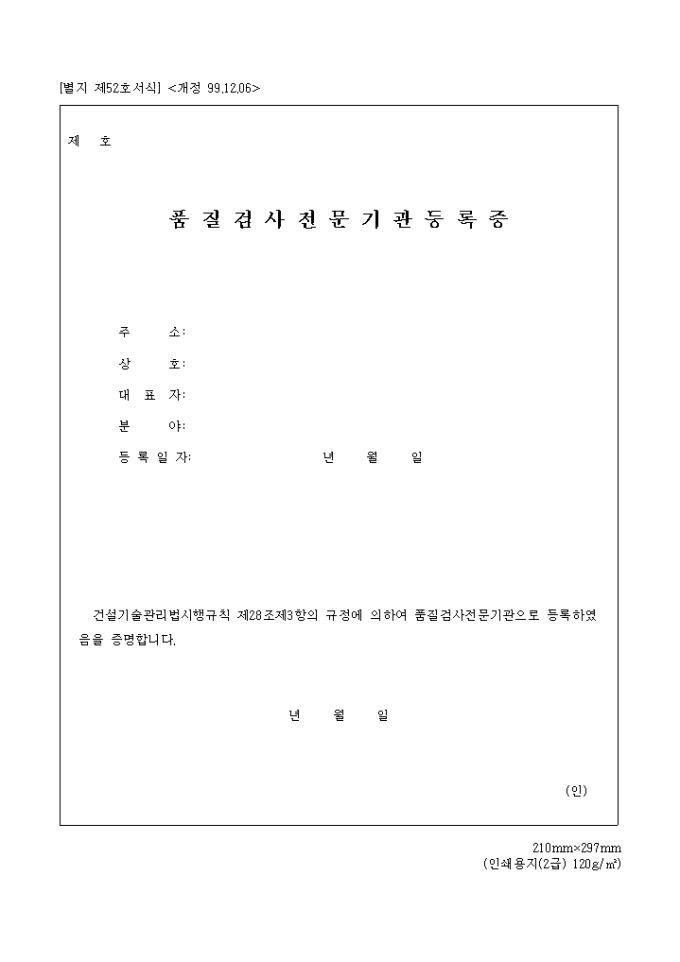 9,000원/월[별지 제52호서식] 건설기술관리법시행규칙 제28조제3항의 규정에 의하여 품질검사전문기관으로 등록하였음을 증명할 때 사용하는 양식입니다.