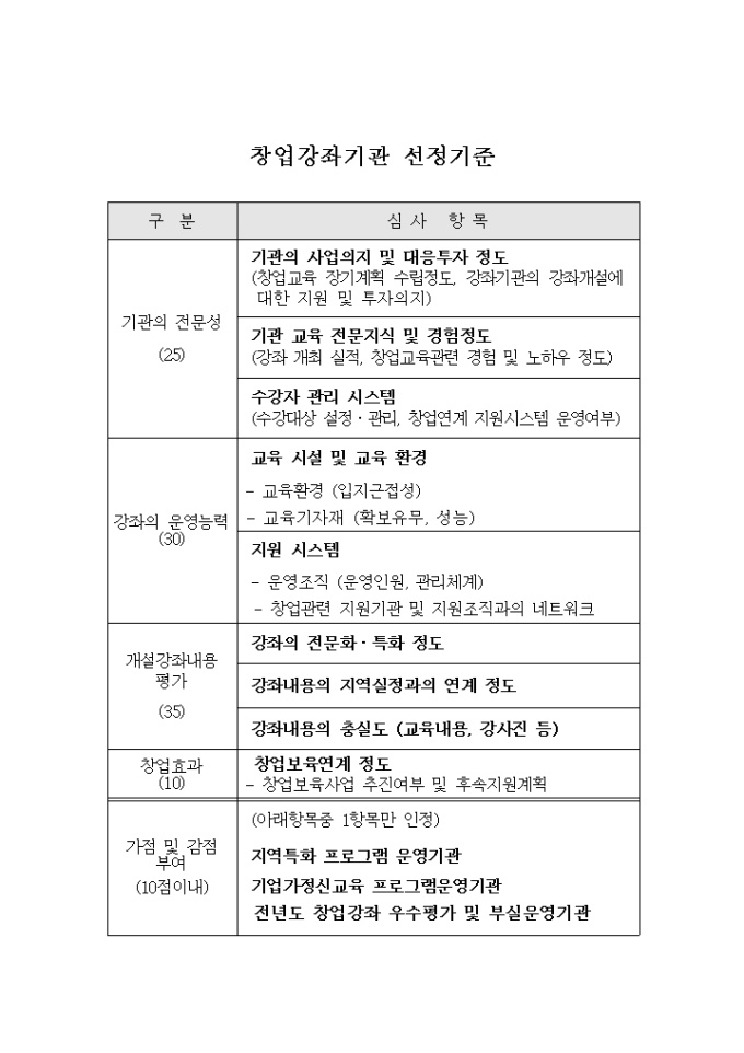 9,000원/월창업강좌기관 선정기준 문서입니다. 기관의 전문성, 강좌의 운영능력, 개설강좌내용평가, 창업효과, 가점 및 감점 부여등의 내용으로 구성되어 있습니다.