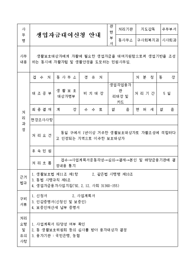 9,000원/월사업계획서 양식입니다. 생활보호대상자에게 자활에 필요한 생업자금을 대여지원함으로써 생업기반을 조성하는 동시에 자활자립 및 생활안정을 도모하는 민원사무 양식입니다.