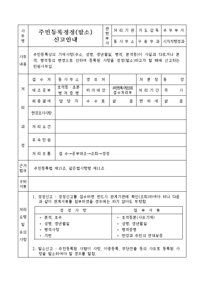 9,000원/월주민등록상의 기재사항(주소, 성명, 생년월일, 병적, 본적등)이 사실과 다르거나 본적, 병적등의 변경으로 인하여 등록된 사항을 정정(말소)하고자 할 때에 신고시에 사용하는 주민등록 정정(말소)신고서 양식입니다.