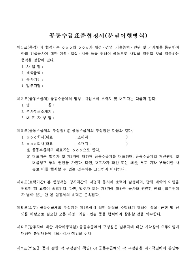 9,000원/월건설산업기본법시행령에 의한 공동도급운영기준 협정서(분담이행방식)양식입니다. 모두16개의 조항으로 구성되어 있습니다.