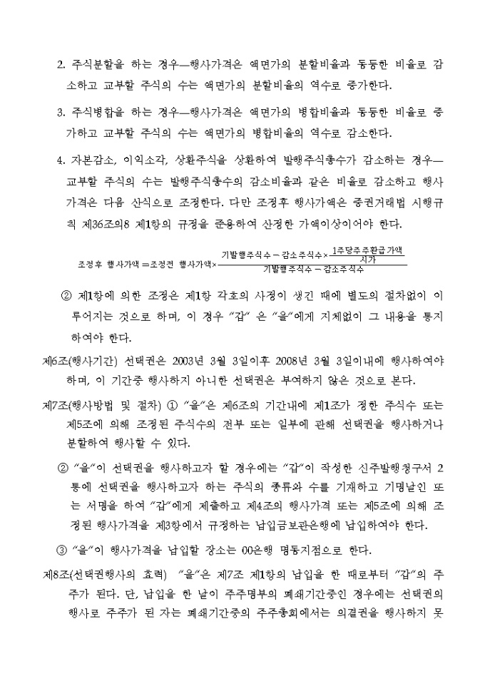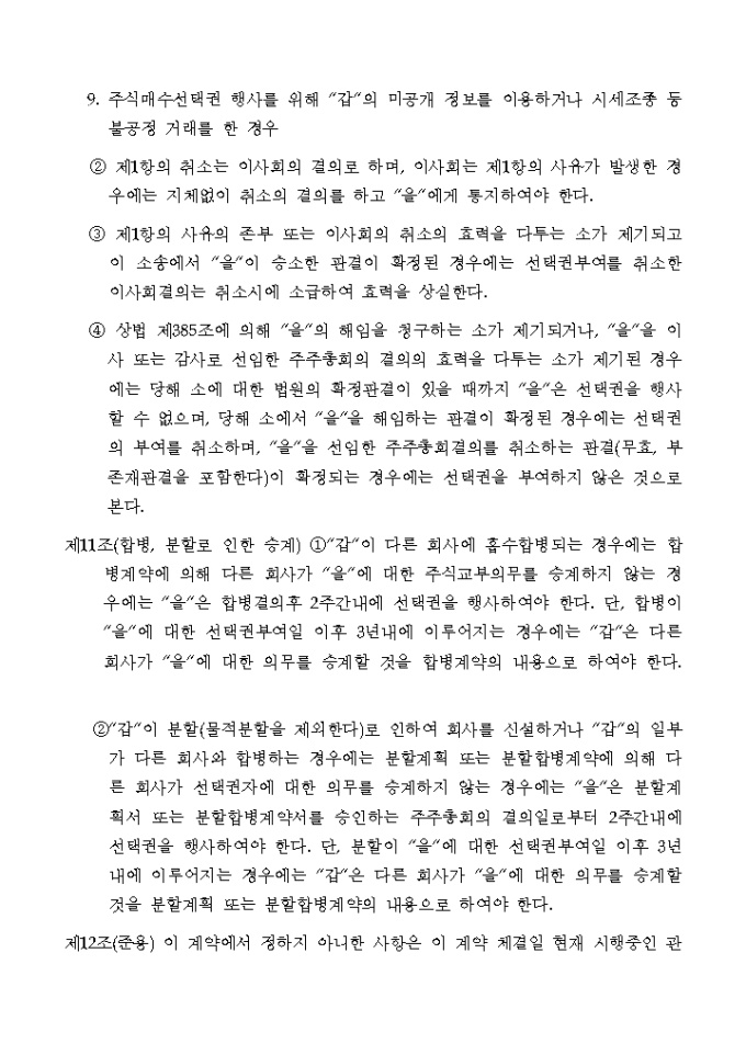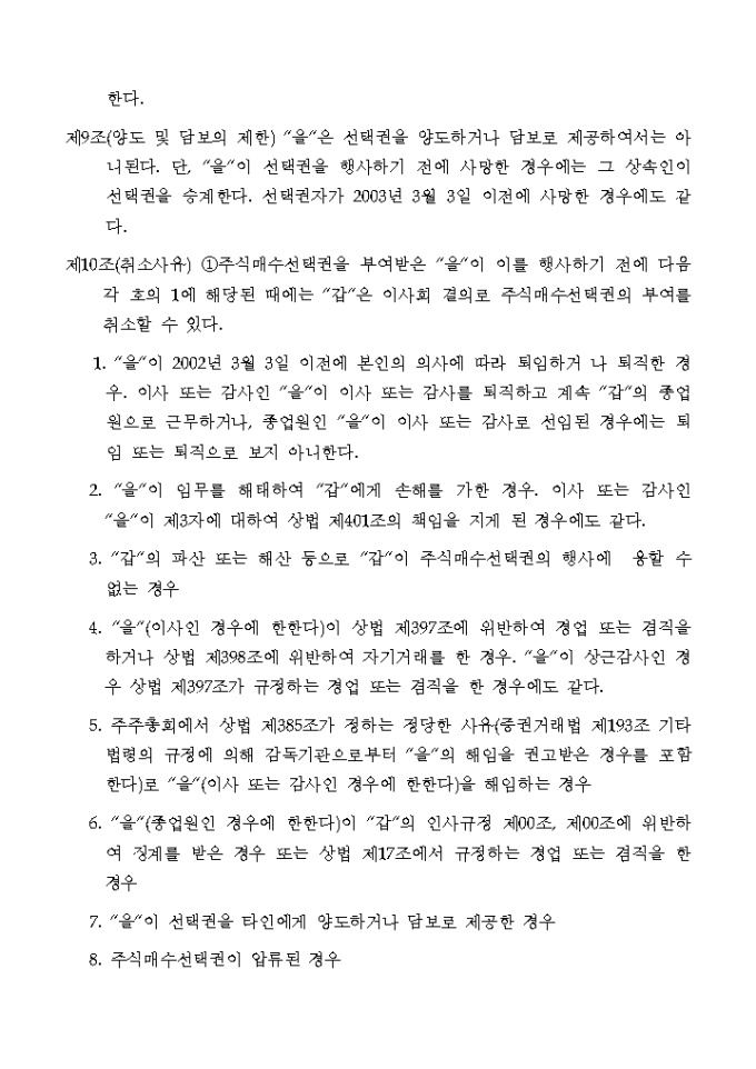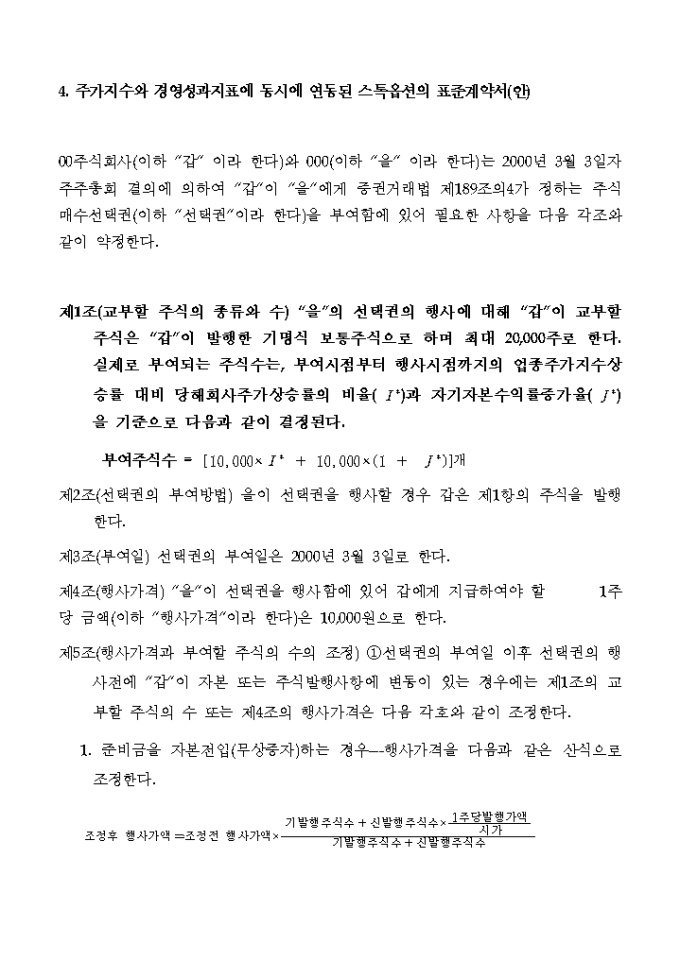 9,000원/월주가지수경영성과지표연동스톡옵션 예제 양식입니다. 00주식회사(이하 갑 이라 한다)와 000(이하 을 이라 한다)는 2000년 3월 3일자 주주총회 결의에 의하여 갑이 을에게 증권거래법 제189조의4가 정하는 주식매수선택권(이하 선택권이라 한다)을 부여함에 있어 필요한 사항을 다음 각조와 같이 약정한다. ...