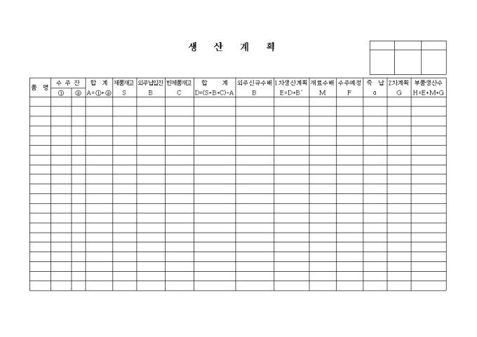 9,000원/월품명별 수주잔,제품재고,외주납입잔,반제품재고,외주신규수배 등을 기록하는 양식입니다.