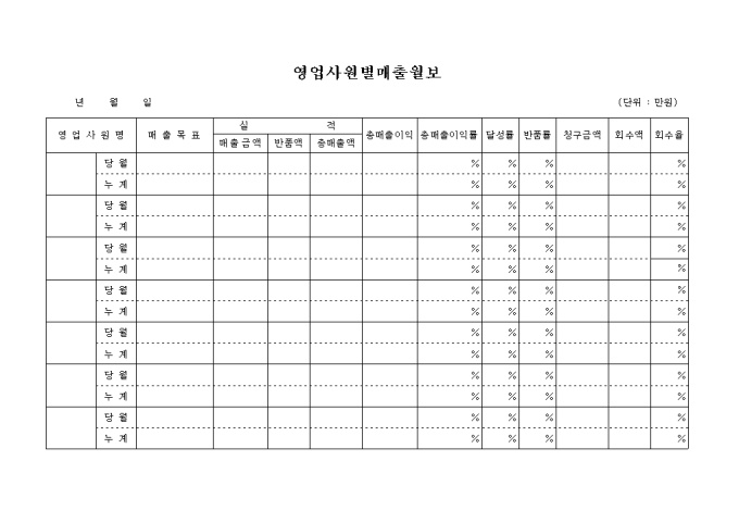 9,000원/월영업사원별 매출목표, 실적, 총매출 이익 등을 기록하는 양식입니다.