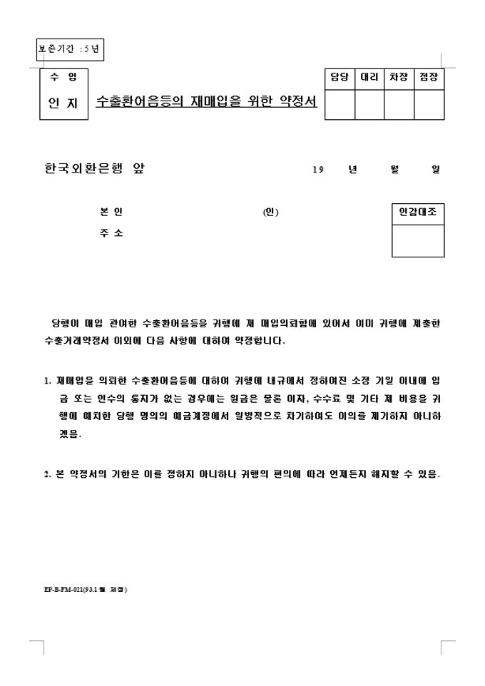 9,000원/월수출환어음등의 재매입을 위한약정서 양식입니다. 당행이 매입 관여한 수출환어음등을 귀행에 재 매입의뢰함에 있어서 이미 귀행에 제출한 수출거래약정서 이외에 다음 사항에 대하여 약정합니다. 1. 재매입을 의뢰한 수출환어음등에 대하여 귀행에 내규에서 정하여진 소정 기일 이내에 입금 또는 인수의 통지가 없는 경우에는 원금은 물론 이자, 수수료 및 기타 제 비용을 귀행에 예치한 당행 명의의 예금계정에서 일방적으로 차기하여도 이의를 제기하지 아니하겠음. ...