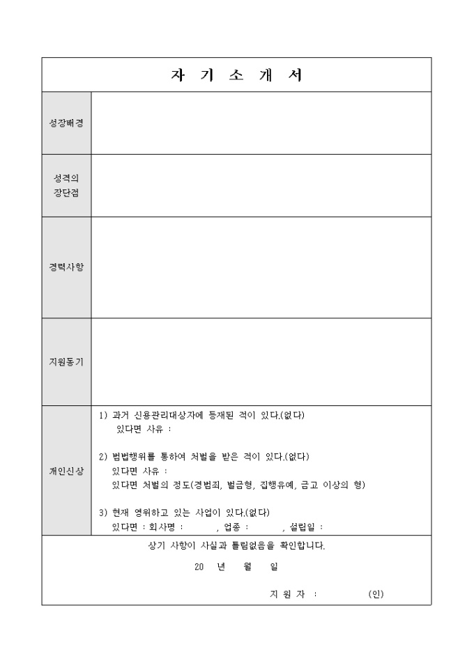 9,000원/월대출 상담사로 입사지원하고자 할때 사용하는 서식으로 기본 이력사항과 자기소개서를 작성합니다.