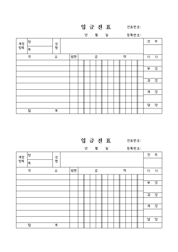 9,000원/월입금전표 양식입니다. 계정항목별 적요와 원면,금액등으로 구성된 전표양식입니다.